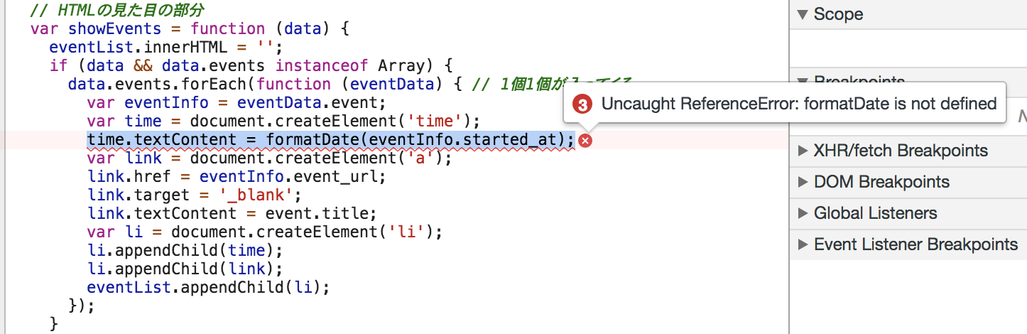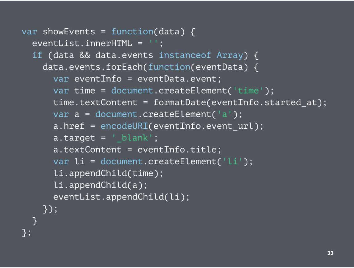 1/*========================= 21. XHRで同じドメインのデータを取得 32. XHRでクロスドメインのデータを取得する 43. JSONPでクロスドメインのデータを取得する 54. 検索ワードでイベント情報を表示する 6 =========================*/ 7 8(function () { 9 'use strict'; 10 11 var searchForm = document.getElementById('search-form'); 12 var searchInput = document.getElementById('search-input'); 13 var eventList = document.getElementById('event-list'); 14 15 var searchEvents = function (event) { 16 event.preventDefault(); 17 18 if (!searchInput.value) { // 空だったら 19 return; 20 } 21 var element = document.createElement('script'); // urlをjsから読み込む 22 element.src = 'http://api.atnd.org/events/?format=jsonp&keyword=' 23 + encodeURI(searchInput.value); 24 document.body.appendChild(element); 25 document.body.removeChild(element); 26 }; 27 28 // HTMLの見た目の部分 29 var showEvents = function (data) { 30 eventList.innerHTML = ''; 31 if (data && data.events instanceof Array) { 32 data.events.forEach(function (eventData) { // 1個1個が入ってくる 33 var eventInfo = eventData.event; 34 var time = document.createElement('time'); 35 time.textContent = formatData(eventInfo.started_at); 36 var link = document.createElement('a'); 37 link.href = eventInfo.event_url; 38 link.target = '_blank'; 39 //link.textContent = event.title; 下記に変更 40 link.textContent = eventInfo.title; 41 var li = document.createElement('li'); 42 li.appendChild(time); 43 li.appendChild(link); 44 eventList.appendChild(li); 45 }); 46 } 47 }; 48 49// 追記 50var formatDate = function (dateString) { 51 var date = new Date(dateString); 52 return (date.getMonth() + 1) + '/' + date.getDate(); 53 }; 54 55 56 searchForm.addEventListener('submit', searchEvents); 57 window.callback = showEvents; 58}()); 59