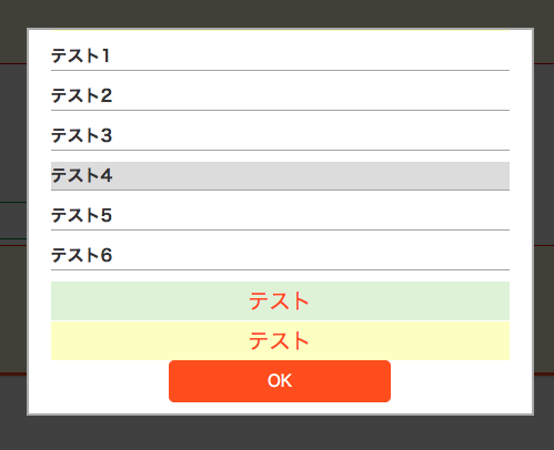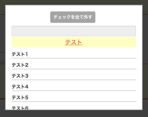 1 <!-- ここからモーダルウィンドウ実装 --> 2 <div id="modal-content"> 3 <!-- モーダルウィンドウのコンテンツ開始 --> 4 <button type="button" name="select_delete" value="select_delete" class="select_delete" onclick="javaScript:DisChecked()">チェックを全て外す</button> 5 <br> 6 <input type="text" id="keyword" name="keyword" size="30" disabled="disabled"/> 7 <div id="material_select"> 8 <div id="meet_select"> 9 <p><a href="javaScript:pullDown('id1')">テスト</a></p> 10 </div> 11 <div id="id1" style="display:none;"> 12 <div class="all-container"> 13 <div id="check-label-container"> 14 <label class="check-label"> 15 <span>テスト1</span> 16 <input type="checkbox" name="check" value="テスト1"> 17 <span class="checkmark"></span> 18 </label> 19 <label class="check-label"> 20 <span>テスト2</span> 21 <input type="checkbox" name="check" value="テスト2"> 22 <span class="checkmark"></span> 23 </label> 24 <label class="check-label"> 25 <span>テスト3</span> 26 <input type="checkbox" name="check" value="テスト1"> 27 <span class="checkmark"></span> 28 </label> 29 <label class="check-label"> 30 <span>テスト4</span> 31 <input type="checkbox" name="check" value="テスト1"> 32 <span class="checkmark"></span> 33 </label> 34 <label class="check-label"> 35 <span>テスト5</span> 36 <input type="checkbox" name="check" value="テスト1"> 37 <span class="checkmark"></span> 38 </label> 39 <label class="check-label"> 40 <span>テスト6</span> 41 <input type="checkbox" name="check" value="テスト1"> 42 <span class="checkmark"></span> 43 </label> 44 </div> 45 </div> 46 </div> 47 <div id="fish_select"> 48 <p><a href="javaScript:pullDown('id2')">テスト</a></p> 49 </div> 50 <div id="id2" style="display:none;"> 51 <div class="all-container"> 52 <div id="check-label-container"> 53 <label class="check-label"> 54 <span>テスト1</span> 55 <input type="checkbox" name="check" value="テスト1"> 56 <span class="checkmark"></span> 57 </label> 58 <label class="check-label"> 59 <span>テスト2</span> 60 <input type="checkbox" name="check" value="テスト2"> 61 <span class="checkmark"></span> 62 </label> 63 </div> 64 </div> 65 </div> 66 <div id="vegetables_select"> 67 <p><a href="javaScript:pullDown('id3')">テスト</a></p> 68 </div> 69 <div id="id3" style="display:none;"> 70 <div class="all-container"> 71 <div id="check-label-container"> 72 <label class="check-label"> 73 <span>テスト1</span> 74 <input type="checkbox" name="check" value="テスト1"> 75 <span class="checkmark"></span> 76 </label> 77 <label class="check-label"> 78 <span>テスト2</span> 79 <input type="checkbox" name="check" value="テスト2"> 80 <span class="checkmark"></span> 81 </label> 82 </div> 83 </div> 84 </div> 85 </div> 86 <div id="select_ok"> 87 <button type="button" name="select_ok" value="select_ok" class="select_ok" onclick="javaScript:OK()">OK</button> 88 </div> 89 </div> 90 <input id="modal-open" value="モーダル表示" class="button-link"> 91 <!-- ここまでモーダルウィンドウ -->