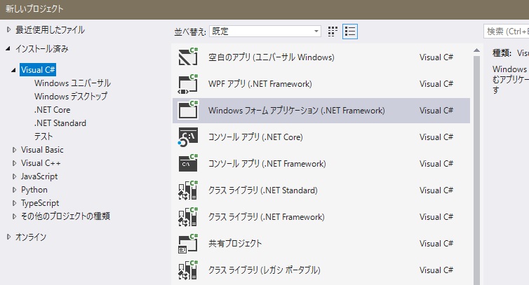 VSCommunity 2017 C#でWindowsフォームを作成したいのですが、プロジェクトを作成したりしたときに VBだと、Windowsフォームが作成できるのですが、C#だとその項目がありません。