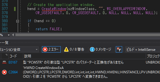 エラー C2664 'HWND CreateWindowExA(DWORD,LPCSTR,LPCSTR,DWORD,int,int,int,int,HWND,HMENU,HINSTANCE,LPVOID)': 引数 2 を 'PCWSTR' から 'LPCSTR' へ変換できません。 UNBROKEN_ AbcCalibrator