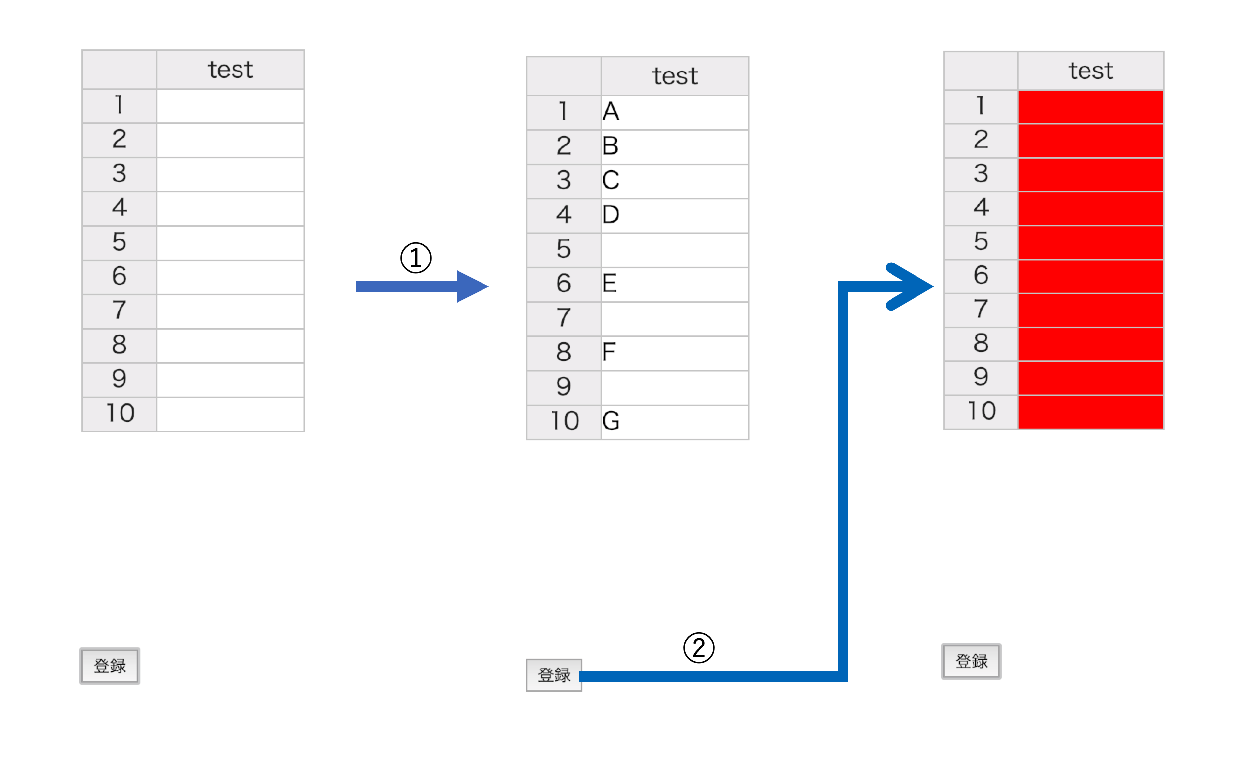 1import React, { Component } from 'react'; 2import { HotTable } from '@handsontable/react'; 3import 'handsontable/dist/handsontable.full.css'; 4 5class Test extends Component { 6 constructor(props) { 7 super(props); 8 this.hotTableComponent = React.createRef(); 9 this.hotSettings = { 10 columns: [ 11 { title: 'test' } 12 ], 13 colWidths: [ 100 ], 14 startCols: 1, 15 startRows: 10, 16 rowHeaders: true, 17 width: 965, 18 height: 400, 19 }; 20 }; 21 createClick = () => { 22 // コメント 23 const commentsPlugin = this.hotTableComponent.current.hotInstance.getPlugin('comments'); 24 // 行数取得 25 const countRows = this.hotTableComponent.current.hotInstance.countRows(); 26 // 列数取得 27 const countCols = this.hotTableComponent.current.hotInstance.countCols(); 28 29 for (let intI = 0; intI < countRows; intI++) { 30 for (let intJ = 0; intJ < countCols; intJ++) { 31 // セル背景色初期化 32 this.hotTableComponent.current.hotInstance.setCellMeta( 33 intI, 34 intJ, 35 'className', 36 'err-style-release' 37 ); 38 // コメント削除 39 commentsPlugin.removeCommentAtCell(intI, intJ); 40 } 41 } 42 }; 43 render() { 44 return ( 45 <div> 46 <HotTable 47 id="hot" 48 ref={this.hotTableComponent} 49 settings={this.hotSettings} 50 /> 51 <button onClick={this.createClick}>登録</button> 52 </div> 53 ); 54 } 55}
