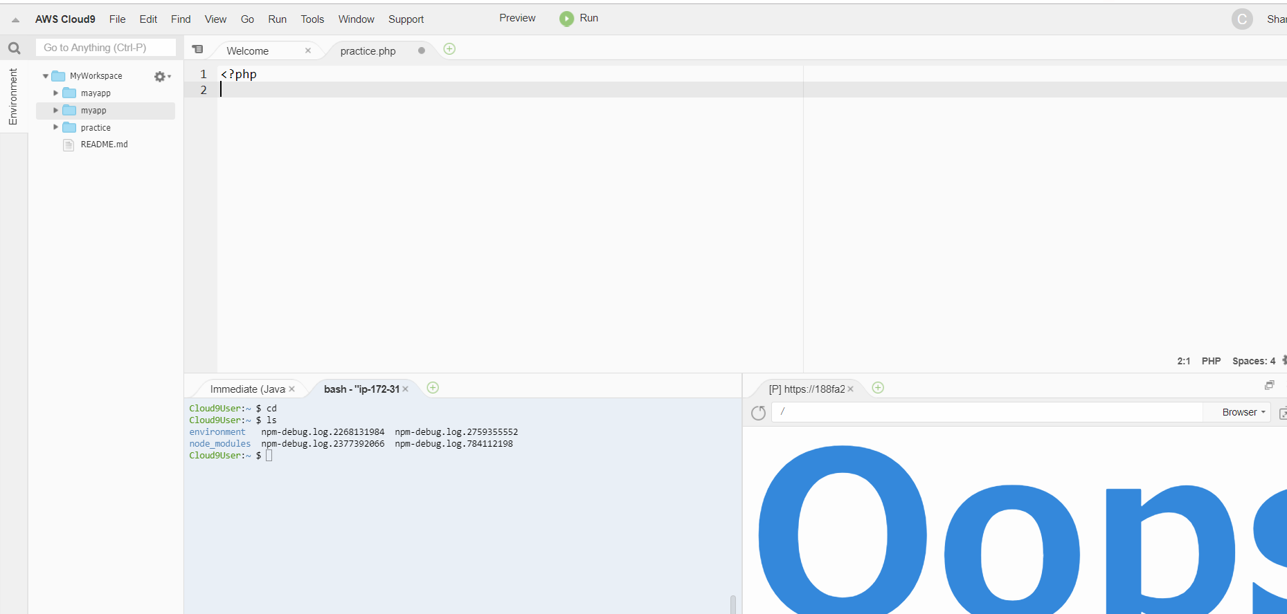 AWScloud9にて、PHPの勉強をしようと思い、ドットインストールを見ながらAWScloud9をインストールし、設定を一通りやったのですが、少し、分からない部分がある為、教えて頂きたいです。