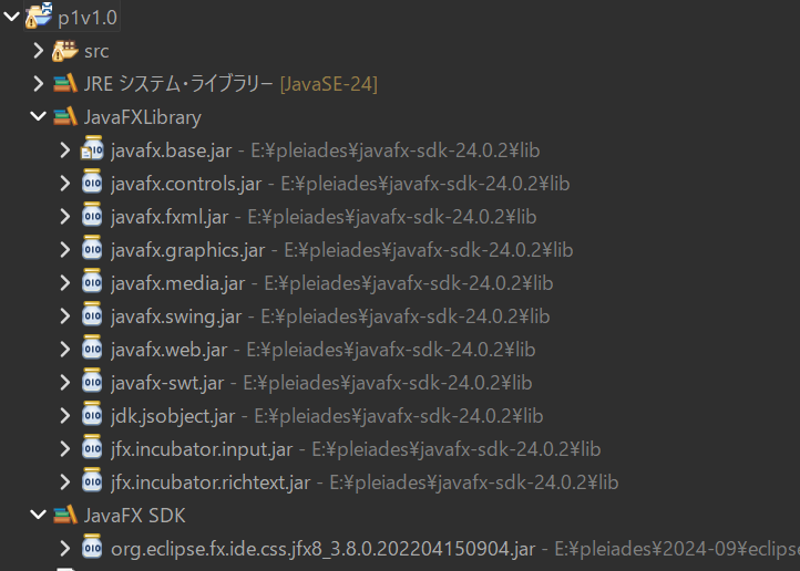 1起動後のメッセージです。 2WARNING: A restricted method in java.lang.System has been called 3WARNING: java.lang.System::load has been called by com.sun.glass.utils.NativeLibLoader in module javafx.graphics (file:/E:/pleiades/javafx-sdk-24.0.2/lib/javafx.graphics.jar) 4WARNING: Use --enable-native-access=javafx.graphics to avoid a warning for callers in this module 5WARNING: Restricted methods will be blocked in a future release unless native access is enabled 6 7WARNING: A terminally deprecated method in sun.misc.Unsafe has been called 8WARNING: sun.misc.Unsafe::allocateMemory has been called by com.sun.marlin.OffHeapArray (file:/E:/pleiades/javafx-sdk-24.0.2/lib/javafx.graphics.jar) 9WARNING: Please consider reporting this to the maintainers of class com.sun.marlin.OffHeapArray 10WARNING: sun.misc.Unsafe::allocateMemory will be removed in a future release