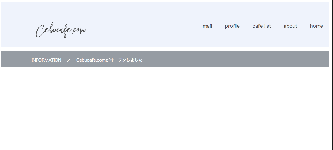 1 <header> 2 <!--ヘッダーの一番上/ロゴとメニュー--> 3<div class="header"> 4<div class="header-logo">Cebucafe.com</div> 5 <div class="header-menu"> 6 <ol> 7 <li a href="">home</li> 8 <li a href="">about</li> 9 <li a herf="">cafe list</li> 10 <li a herf="">profile</li> 11 <li a herf="">mail</li> 12 </ol> 13 </div> 14</div> 15<!--ヘッダーのニュースインフォ--> 16 <div class="header-news"> 17 <p>INFORMATION / Cebucafe.comがオープンしました</p> 18 </div> 19 </header> 20 21 22 23CSS 24 25.header{ 26 background-color:#eff3fd; 27 width:100%; 28 height:154px; 29 color:#4b4b4b; 30} 31 32.header-logo{ 33 font-size:72px; 34 font-family:"Puzzled-Regular"; 35 padding-left:120px; 36 padding-top:50px; 37 float: left; 38} 39 40li{ 41 list-style: none; 42 float: right; 43 padding:71px 22px; 44 45} 46.header-news{ 47 height:55px; 48 width:100%; 49 background-color: #969ca4; 50} 51 52.header-news p{ 53 color:white; 54 font-size:14px; 55 padding:22px 0 22px 106px; 56} 57 58