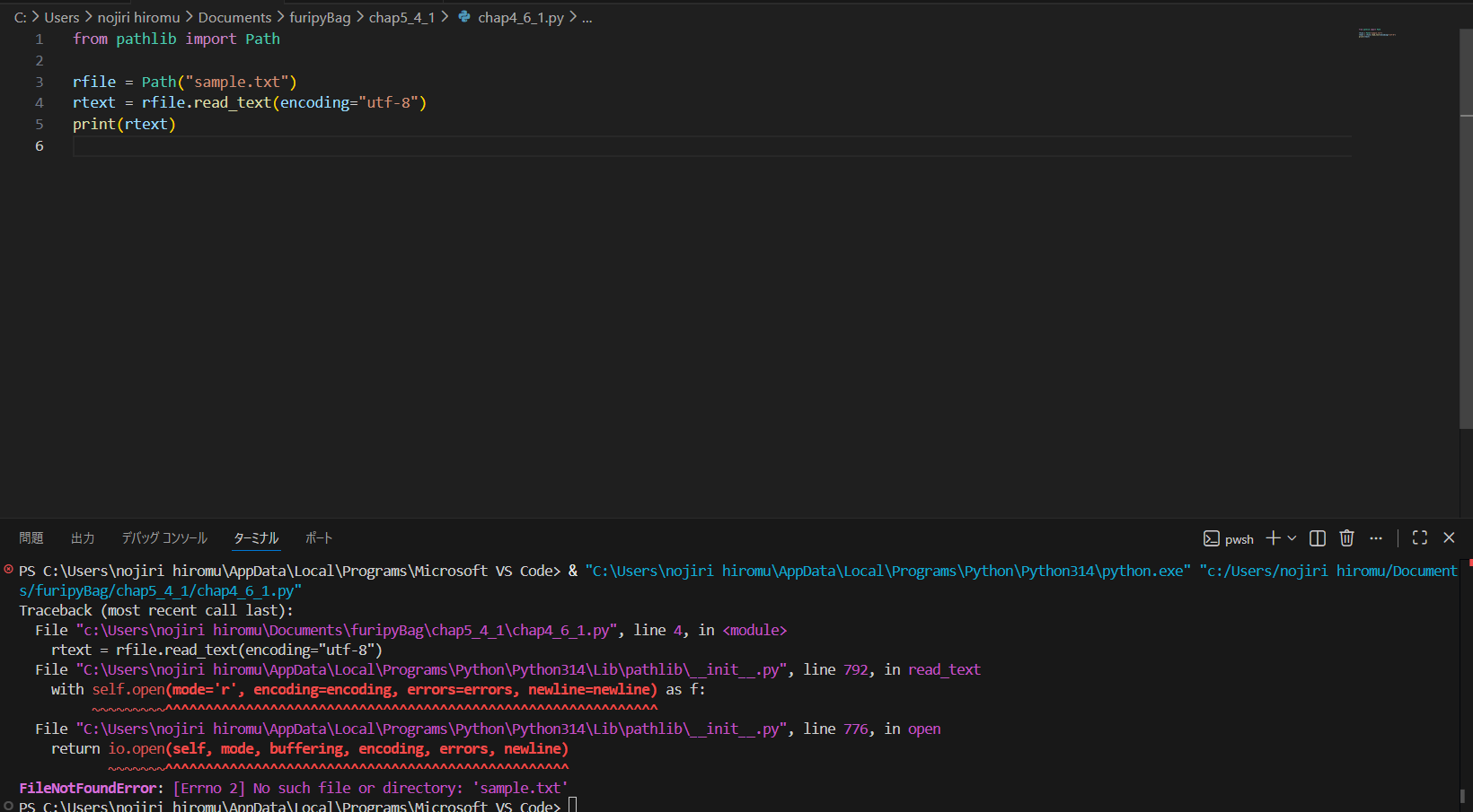 1PS C:\Users\nojiri hiromu\AppData\Local\Programs\Microsoft VS Code> & "C:\Users\nojiri hiromu\AppData\Local\Programs\Python\Python314\python.exe" "c:/Users/nojiri hiromu/Documents/furipyBag/chap5_4_1/chap4_6_1.py" 2Traceback (most recent call last): 3 File "c:\Users\nojiri hiromu\Documents\furipyBag\chap5_4_1\chap4_6_1.py", line 4, in <module> 4 rtext = rfile.read_text(encoding="utf-8") 5 File "C:\Users\nojiri hiromu\AppData\Local\Programs\Python\Python314\Lib\pathlib\__init__.py", line 792, in read_text 6 with self.open(mode='r', encoding=encoding, errors=errors, newline=newline) as f: 7 ~~~~~~~~~^^^^^^^^^^^^^^^^^^^^^^^^^^^^^^^^^^^^^^^^^^^^^^^^^^^^^^^^^^^^^ 8 File "C:\Users\nojiri hiromu\AppData\Local\Programs\Python\Python314\Lib\pathlib\__init__.py", line 776, in open 9 return io.open(self, mode, buffering, encoding, errors, newline) 10 ~~~~~~~^^^^^^^^^^^^^^^^^^^^^^^^^^^^^^^^^^^^^^^^^^^^^^^^^^ 11FileNotFoundError: [Errno 2] No such file or directory: 'sample.txt'