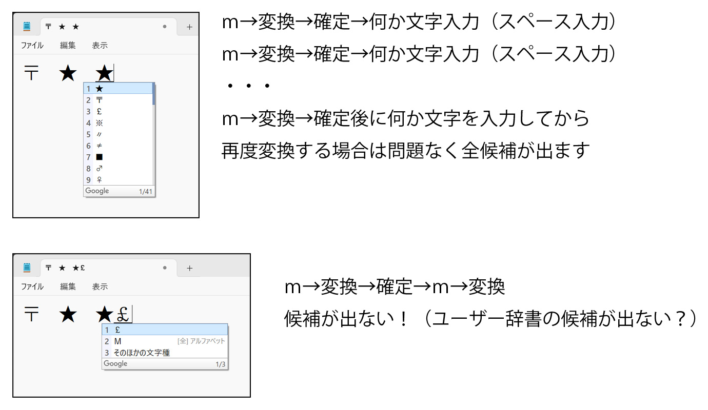「m」で色々なマークが選択できるようにユーザー辞書登録していますが連続して「m」変換しようとした場合、添付画像のように変換候補が表示されません。