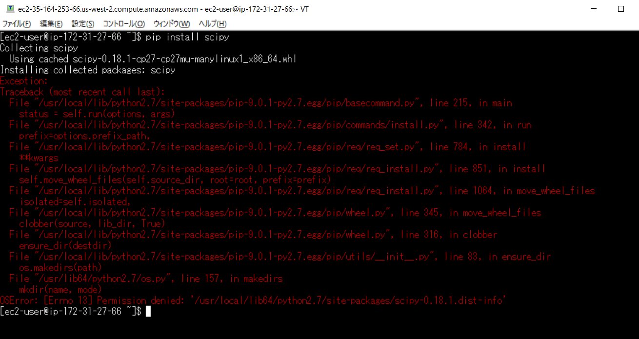 [ec2-user@ip-172-31-27-66 ~]$ pip install scipy Collecting scipy Using cached scipy-0.18.1-cp27-cp27mu-manylinux1_x86_64.whl Installing collected packages: scipy Exception: Traceback (most recent call last): File "/usr/local/lib/python2.7/site-packages/pip-9.0.1-py2.7.egg/pip/basecommand.py", line 215, in main status = self.run(options, args) File "/usr/local/lib/python2.7/site-packages/pip-9.0.1-py2.7.egg/pip/commands/install.py", line 342, in run prefix=options.prefix_path, File "/usr/local/lib/python2.7/site-packages/pip-9.0.1-py2.7.egg/pip/req/req_set.py", line 784, in install **kwargs File "/usr/local/lib/python2.7/site-packages/pip-9.0.1-py2.7.egg/pip/req/req_install.py", line 851, in install self.move_wheel_files(self.source_dir, root=root, prefix=prefix) File "/usr/local/lib/python2.7/site-packages/pip-9.0.1-py2.7.egg/pip/req/req_install.py", line 1064, in move_wheel_files isolated=self.isolated, File "/usr/local/lib/python2.7/site-packages/pip-9.0.1-py2.7.egg/pip/wheel.py", line 345, in move_wheel_files clobber(source, lib_dir, True) File "/usr/local/lib/python2.7/site-packages/pip-9.0.1-py2.7.egg/pip/wheel.py", line 316, in clobber ensure_dir(destdir) File "/usr/local/lib/python2.7/site-packages/pip-9.0.1-py2.7.egg/pip/utils/__init__.py", line 83, in ensure_dir os.makedirs(path) File "/usr/lib64/python2.7/os.py", line 157, in makedirs mkdir(name, mode) OSError: [Errno 13] Permission denied: '/usr/local/lib64/python2.7/site-packages/scipy-0.18.1.dist-info' [ec2-user@ip-172-31-27-66 ~]$