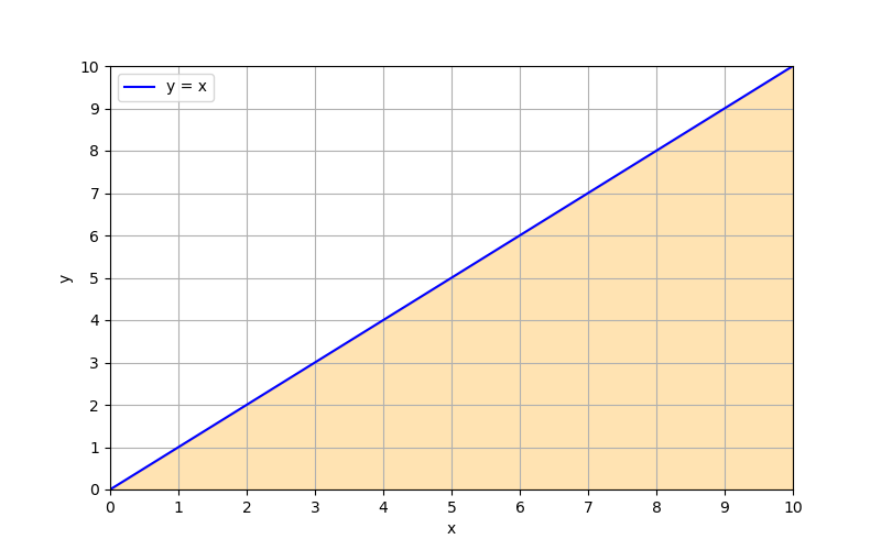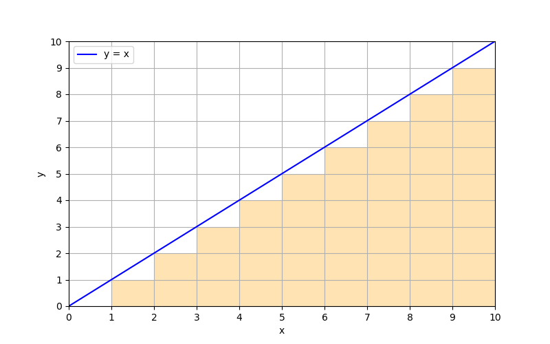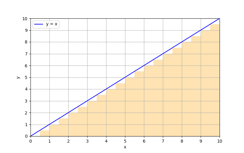 これは幅が1で高さがy = xよりx、の長方形を9個並べて三角形の面積を近似しようとしている。これを区分求積法と呼ぶ。