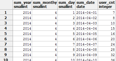 1SELECT sum_year as T_DATE ,user_cnt as M_NO 2FROM t_sumlist 3WHERE sum_month = 12 4AND sum_day = 31 5AND sum_year >= 2010 6AND sum_year <= (2010 + INTERVAL '2' YEAR) ;