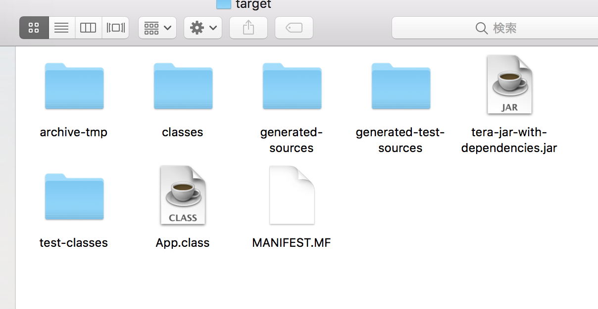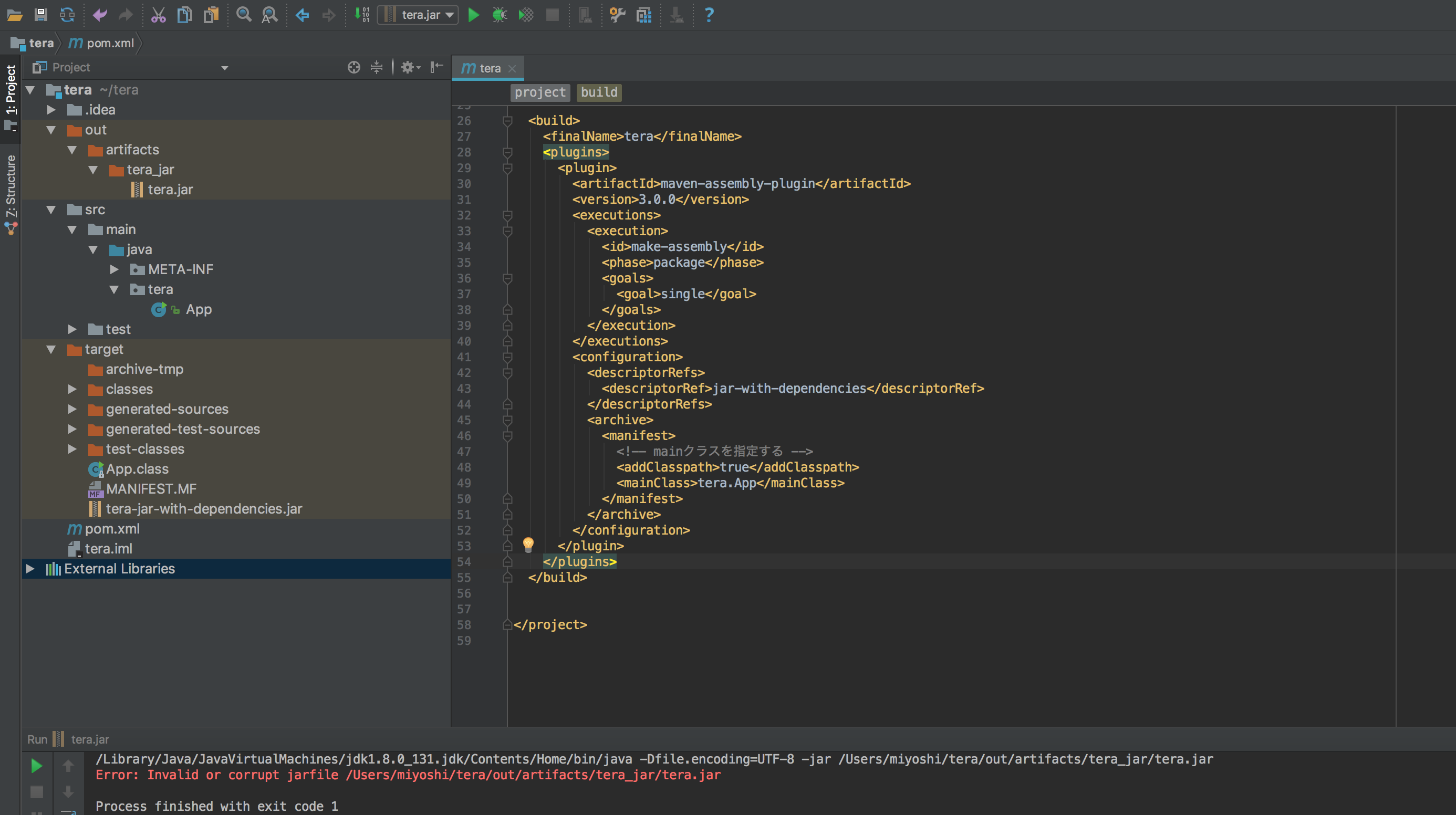 miyoshinoMacBook-Pro:target miyoshi$ java -jar tera-jar-with-dependencies.jar エラー: メイン・クラスtera.Appが見つからなかったかロードできませんでした