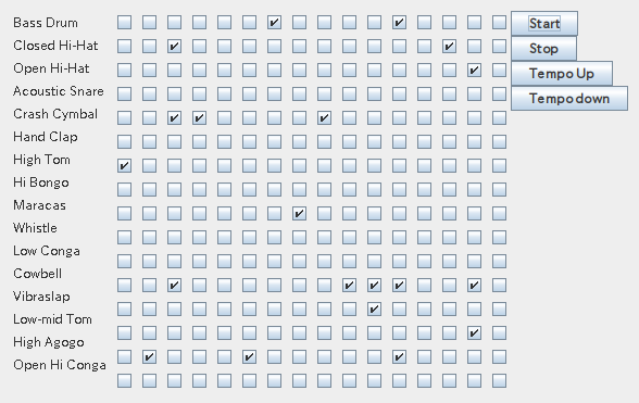 実際、ドラムマシンのプログラムを写経したけど、僕自身もGUIのコードを「直打ち」したのは随分と久しぶりなんだ。通常、何にせよGUIビルダ使うしな。直打ちすると、どうしても「似たよーな形式のメソッドを」書きまくるハメになるんで、精神衛生上宜しくない(笑)。ホント「作業」になってその部分はつまんないんだよ(笑)。