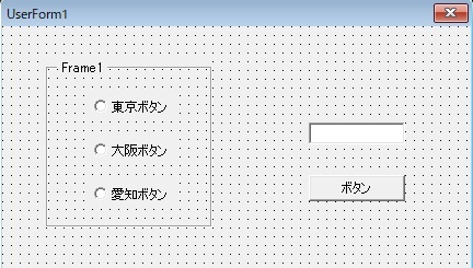 1Option Explicit 2 3Dim todofuken As String 4 5Private Sub ボタン_Click() 6 TextBox1.Value = todofuken 7End Sub 8 9Private Sub 愛知ボタン_Click() 10 todofuken = 愛知ボタン.Tag 11End Sub 12 13Private Sub 大阪ボタン_Click() 14 todofuken = 大阪ボタン.Tag 15End Sub 16 17Private Sub 東京ボタン_Click() 18 todofuken = 東京ボタン.Tag 19End Sub 20 21