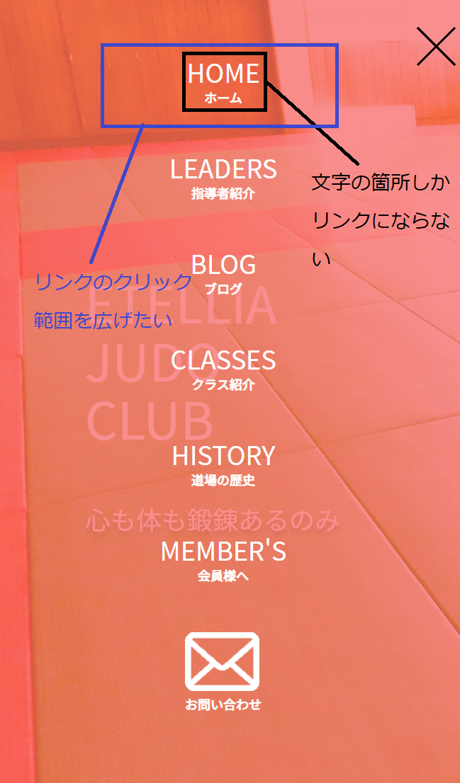 <nav id="navi"> <div class="container flex"> <h1 class="site-title"> <img src="/img/logo-navigation.png" alt="ロゴ" class="logo"> </h1><!-- /.site-title --> <ul class="list-nav"> <li><a href="#"> <span class="en">HOME</span> <span class="ja">ホーム</span> </a> </li> <li><a href="#leaders"> <span class="en">LEADERS</span> <span class="ja">指導者紹介</span> </a> </li> <li><a href="#blog"> <span class="en">BLOG</span> <span class="ja">ブログ</span> </a> </li> <li><a href="#classes"> <span class="en">CLASSES</span> <span class="ja">クラス紹介</span> </a> </li> <li><a href="#"> <span class="en">HISTORY</span> <span class="ja">道場の歴史</span> </a> </li> <li><a href="#"> <span class="en">MEMBER'S</span> <span class="ja">会員様へ</span> </a> <li class="sp-contact"><a href="#"> <img src="/img/mail-mark.png" alt="メール"> <span class="ja">お問い合わせ</span> </a> </li> </li> </ul> <!-- /.list-nav --> </div><!-- /.container --> <div class="contact drop-shadow"> <a href="#"> <img src="/img/mail-mark.png" alt="メール"> <p>お問い合わせ</p> </a> </div><!-- /.contact --> </nav> <!-- /#navi -->