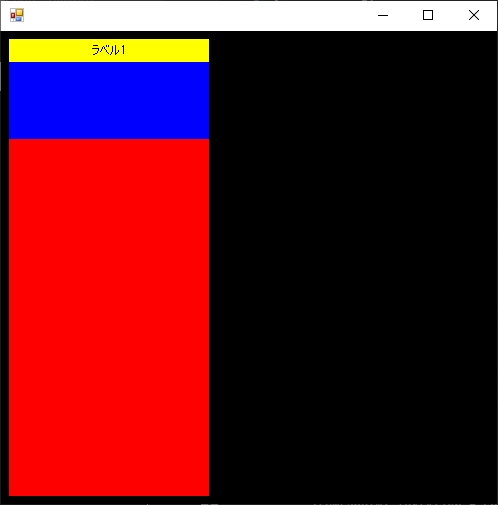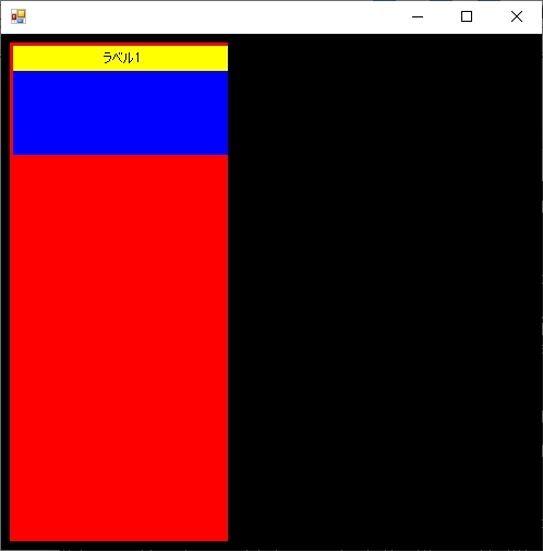 1 public WindowTest_MainFrame() 2 { 3 this.Size = new Size(512, 512); 4 5 Panel mainPane = new Panel(); 6 mainPane.BackColor = Color.Black; 7 mainPane.Dock = DockStyle.Fill; 8 mainPane.Padding = new Padding(8); 9 this.Controls.Add(mainPane); 10 11 Panel innerLeftPane = new Panel(); 12 innerLeftPane.BackColor = Color.Red; 13 innerLeftPane.Dock = DockStyle.Left; 14 mainPane.Controls.Add(innerLeftPane); 15 16 Panel itemPane01 = new Panel(); 17 itemPane01.BackColor = Color.Blue; 18 itemPane01.Width = innerLeftPane.Width; 19 innerLeftPane.Controls.Add(itemPane01); 20 21 Label itemLabel01 = new Label(); 22 itemLabel01.Text = "ラベル1"; 23 itemLabel01.Width = itemPane01.Width; 24 itemLabel01.BackColor = Color.Yellow; 25 itemLabel01.TextAlign = ContentAlignment.MiddleCenter; 26 itemPane01.Controls.Add(itemLabel01); 27 }