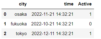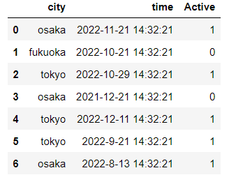 3df = pd.DataFrame({'city':['FUK','TKO','FUK','TKO'], 'time':['2022-01-01','2022-02-01','2022-03-01','2022-04-01'], 'Active':[0,1,0,1]})