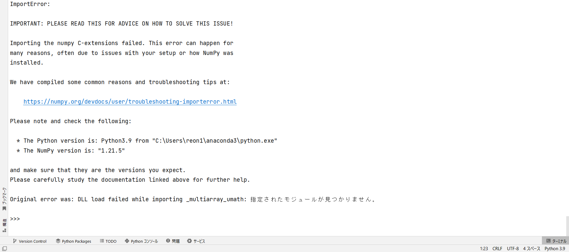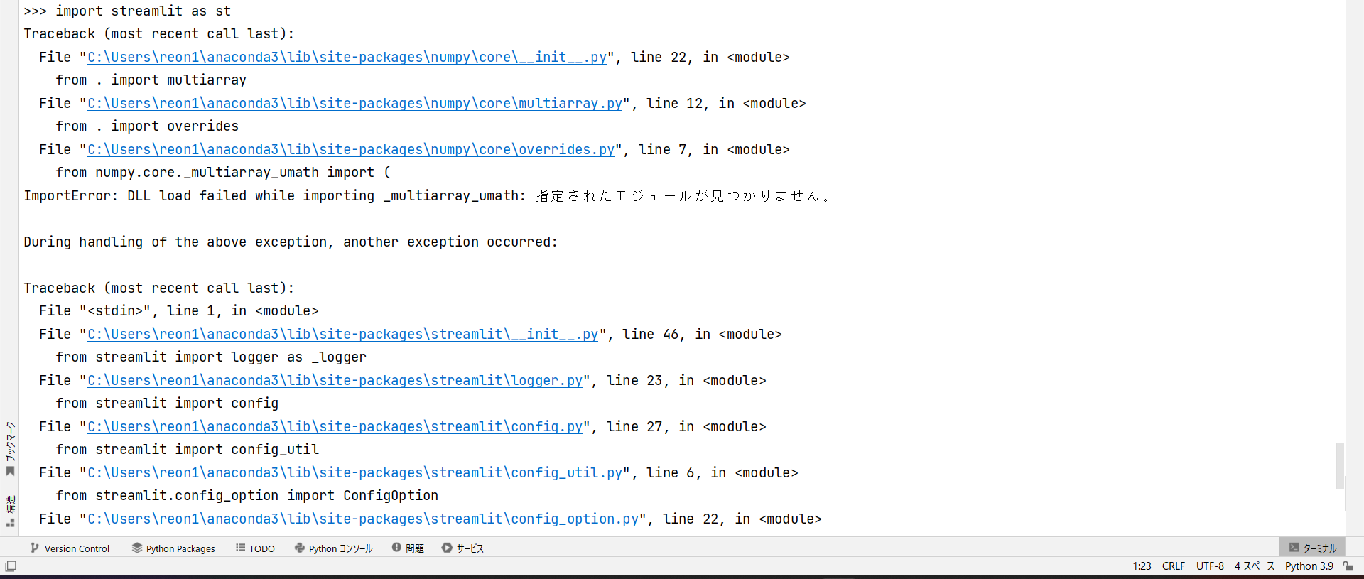 pychramのターミナルにて、「python」 と入力すると以下のような警告が出ます。streamlitをimport できない直接の理由にかかわるのかわかりませんが、念のため記述します。