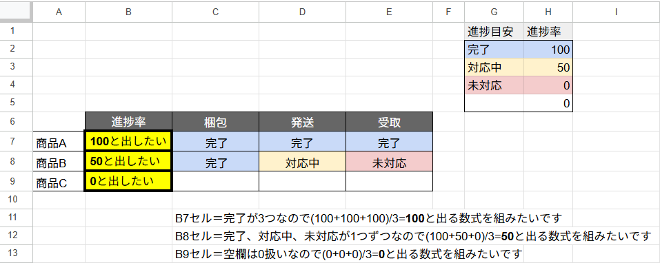 B7:B9に各項目のステータスに応じた進捗率を自動で表示する数式を組みたいと考えています。