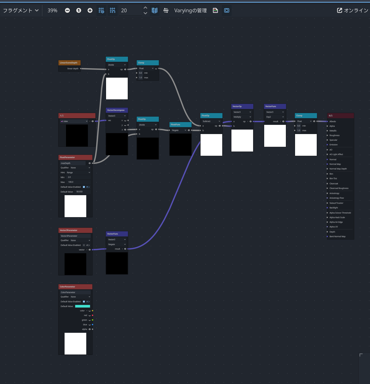 処理内容は: LinearDepthノードでカメラからの物体までの距離とviewノードまでの距離を使ってそこにベクトルの値を掛け算して、ランベルト・ベールの法則を使いexp()ノードで最後描画していいます。