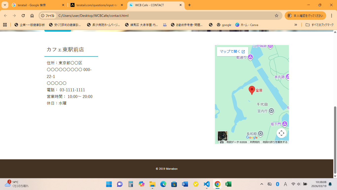 <body> <div id="contact" class="big-bg"> <header class="page-header wrapper"> <h1><a href="index.html"><img class="logo" src="images/logo.svg" alt="WCBカフェホーム"></a></h1> <nav> <ul class="main-nav"> <li><a href="news.html">News</a></li> <li><a href="menu.html">Menu</a></li> <li><a href="contact.html">contact</a></li> </ul> </nav> </header> <div class="wrapper"> <h2 class="page-title">Contact</h2> <form action="#"> <div> <label for="name">お名前</label> <input type="text" id="name" name="your-name"> </div> <div> <label for="email">メールアドレス</label> <input type="email" id="email" name="your-email"> </div> <div> <label for="message">メッセージ</label> <textarea id="message" name="your-message"></textarea> </div> <input type="submit" class="button" value="送信"> </form> </div><!-- /wrapper --> </div><!-- /#contact --> <section id="location"> <div class="wrapper"> <div class="location-info"> <h3 class="sub-title">カフェ東駅前店</h3> <p> 住所:東京都〇〇区<br> 〇〇〇〇〇〇〇〇〇 000-22-1<br> 〇〇〇〇〇<br> 電話: 03-1111-1111<br> 営業時間: 10:00~ 20:00<br> 休日:水曜 </p> </div><!-- locatiion --> <div class="locatiion-map"> <iframe src="https://www.google.com/maps/embed?pb=!1m18!1m12!1m3!1d3240.6678652095134!2d139.75022457457158!3d35.68517932975915!2m3!1f0!2f0!3f0!3m2!1i1024!2i768!4f13.1!3m3!1m2!1s0x60188c0d02d8064d%3A0xd11a5f0b379e6db7!2z55qH5bGF!5e0!3m2!1sja!2sjp!4v1773379531211!5m2!1sja!2sjp" width="800" height="400" style="border:0;" allowfullscreen="" loading="lazy" referrerpolicy="no-referrer-when-downgrade"></iframe> </div><!-- locatiion --> </div><!-- /wrapper --> </section><!-- /#location --> <footer> <div class="wrapper"> <p><small>© 2019 Manabox</small></p> </div> </footer> </body>