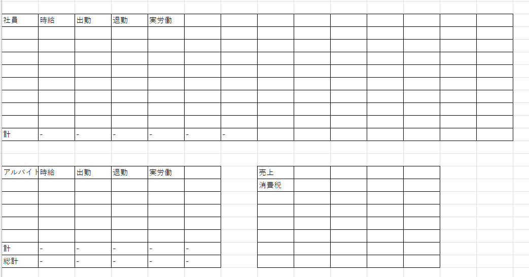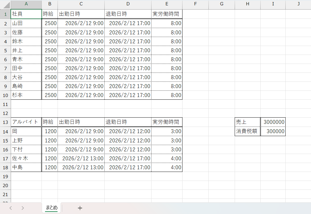 - B.xlsx には、A.xlsx と同じ日付における各アルバイトの勤怠実績を記録した表