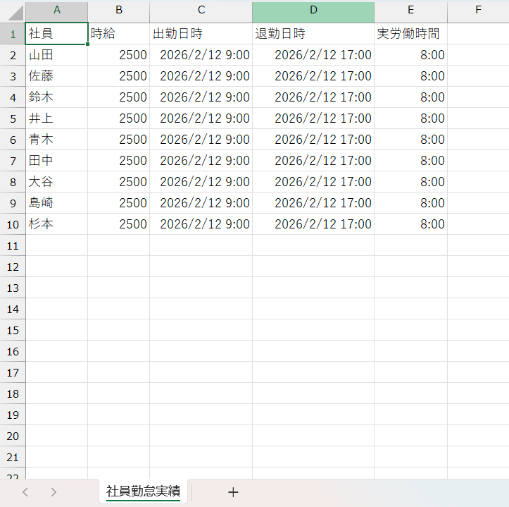 この表のデータ行(列見出し行を除く範囲)の行数は、作成時点における社員人数に応じて