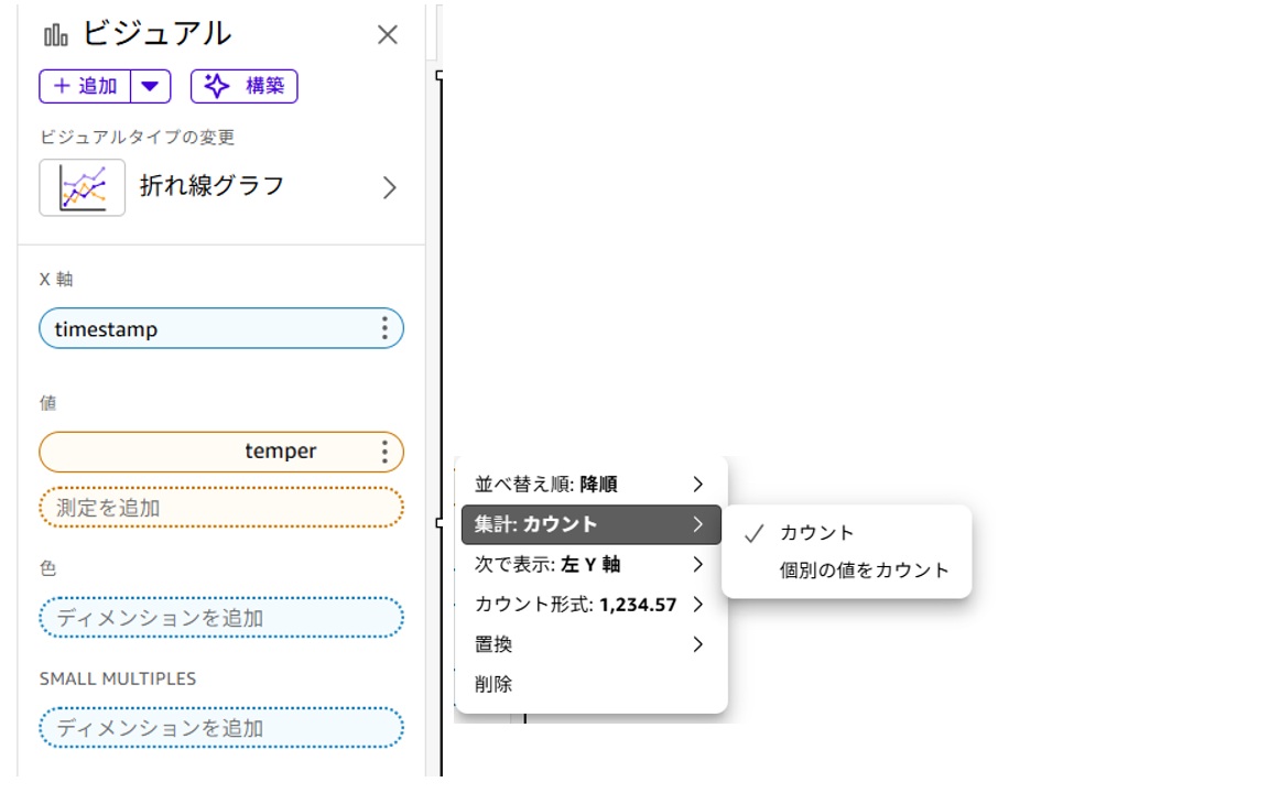 quicksightでは、X軸にtime、Y軸にtemperatureの折れ線グラフを作りたい