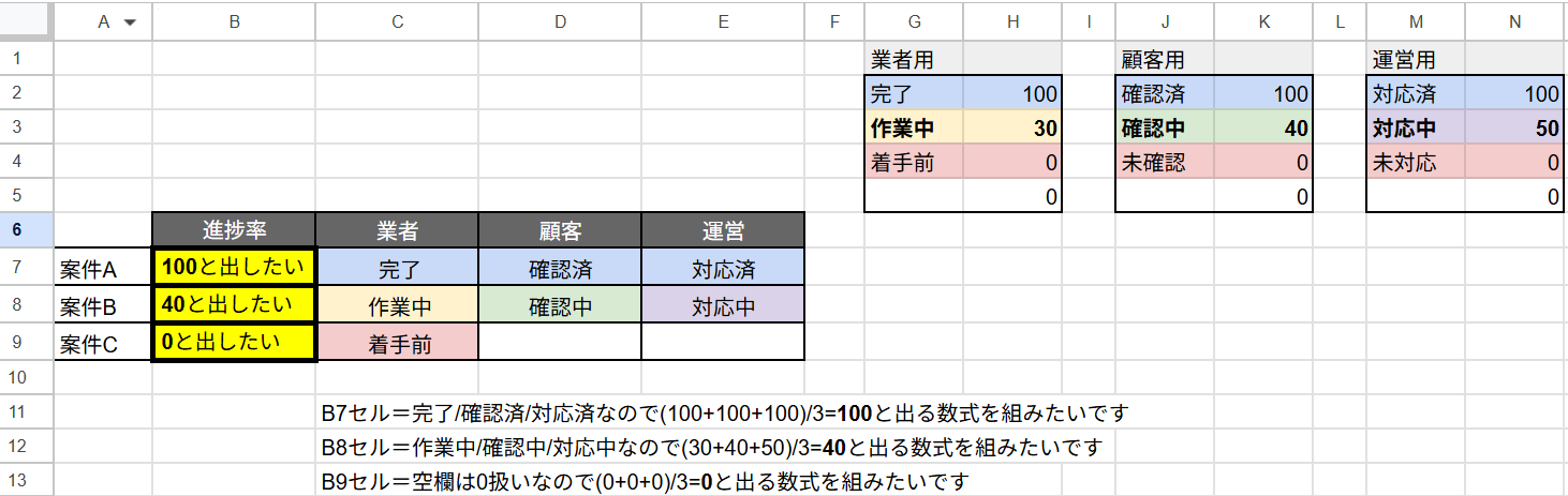 B7:B9に各項目のステータスに応じた進捗率を自動で表示する数式を組みたいと考えています。