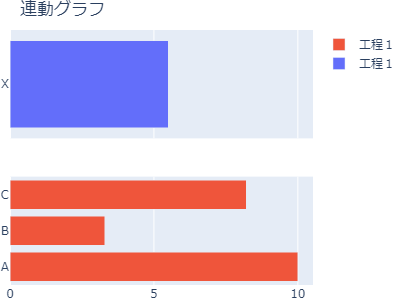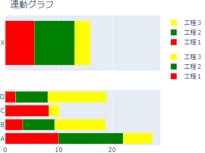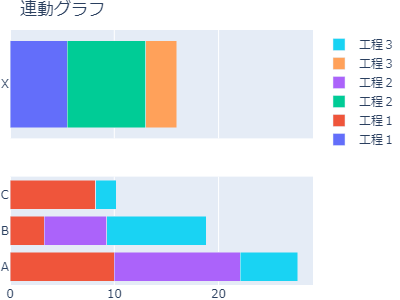 1fig = make_subplots(rows=2, cols=1, shared_xaxes=True) 2 3data1 = [go.Bar(y=df1.index, 4 x=df1.iloc[:, i], 5 name=df1.columns[i], 6 orientation="h" 7 ) 8 for i in range(len(df1.columns))] 9 10 11data2 = [go.Bar(y=df2.index, 12 x=df2.iloc[:, i], 13 name=df2.columns[i], 14 orientation="h") 15 for i in range(len(df2.columns))] 16 17fig.add_trace(data1[0],1,1) 18fig.add_trace(data2[0],2,1) 19 20fig.update_layout(title="連動グラフ", 21 barmode="stack", 22 width=400, height=300, 23 margin=go.layout.Margin(l=0, r=0, b=0, t=30), 24 ) 25fig.show()