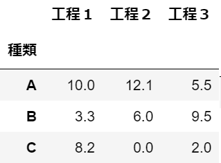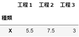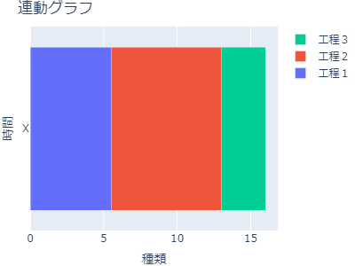 1import pandas as pd 2import plotly.graph_objs as go 3import plotly.io as pio 4from plotly.subplots import make_subplots 5 6df1 = pd.DataFrame(data=(["X",5.5, 7.5, 3],), 7 columns=["種類", "工程1", "工程2", "工程3"] 8 ) 9 10df2 = pd.DataFrame(data=(["A",10, 12.1, 5.5], ["B", 3.3, 6, 9.5], ["C", 8.2, 0 ,2]), 11 columns=["種類", "工程1", "工程2", "工程3"] 12 ) 13 14df1 = df1.set_index('種類') 15df2 = df2.set_index('種類')
