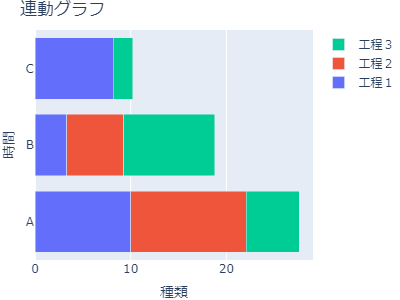 1data1 = [go.Bar(y=df1.index, 2 x=df1.iloc[:, i], 3 name=df1.columns[i], 4 orientation="h") 5 for i in range(len(df1.columns))] 6layout = go.Layout( 7 title=go.layout.Title(text="連動グラフ"), 8 xaxis=go.layout.XAxis(title=df1.index.name), 9 yaxis=go.layout.YAxis(title="時間"), 10 barmode="stack", 11 width=400, height=300, 12 margin=go.layout.Margin(l=0, r=0, b=0, t=30), 13 14) 15fig1 = go.Figure(data=data1, layout=layout) 16# fig.update_traces(orientation="h") 17fig1.show() 18 19data2 = [go.Bar(y=df2.index, 20 x=df2.iloc[:, i], 21 name=df2.columns[i], 22 orientation="h") 23 for i in range(len(df2.columns))] 24layout = go.Layout( 25 title=go.layout.Title(text="連動グラフ"), 26 xaxis=go.layout.XAxis(title=df2.index.name), 27 yaxis=go.layout.YAxis(title="時間"), 28 barmode="stack", 29 width=400, height=300, 30 margin=go.layout.Margin(l=0, r=0, b=0, t=30), 31 32) 33fig2 = go.Figure(data=data2, layout=layout) 34# fig.update_traces(orientation="h") 35fig2.show()